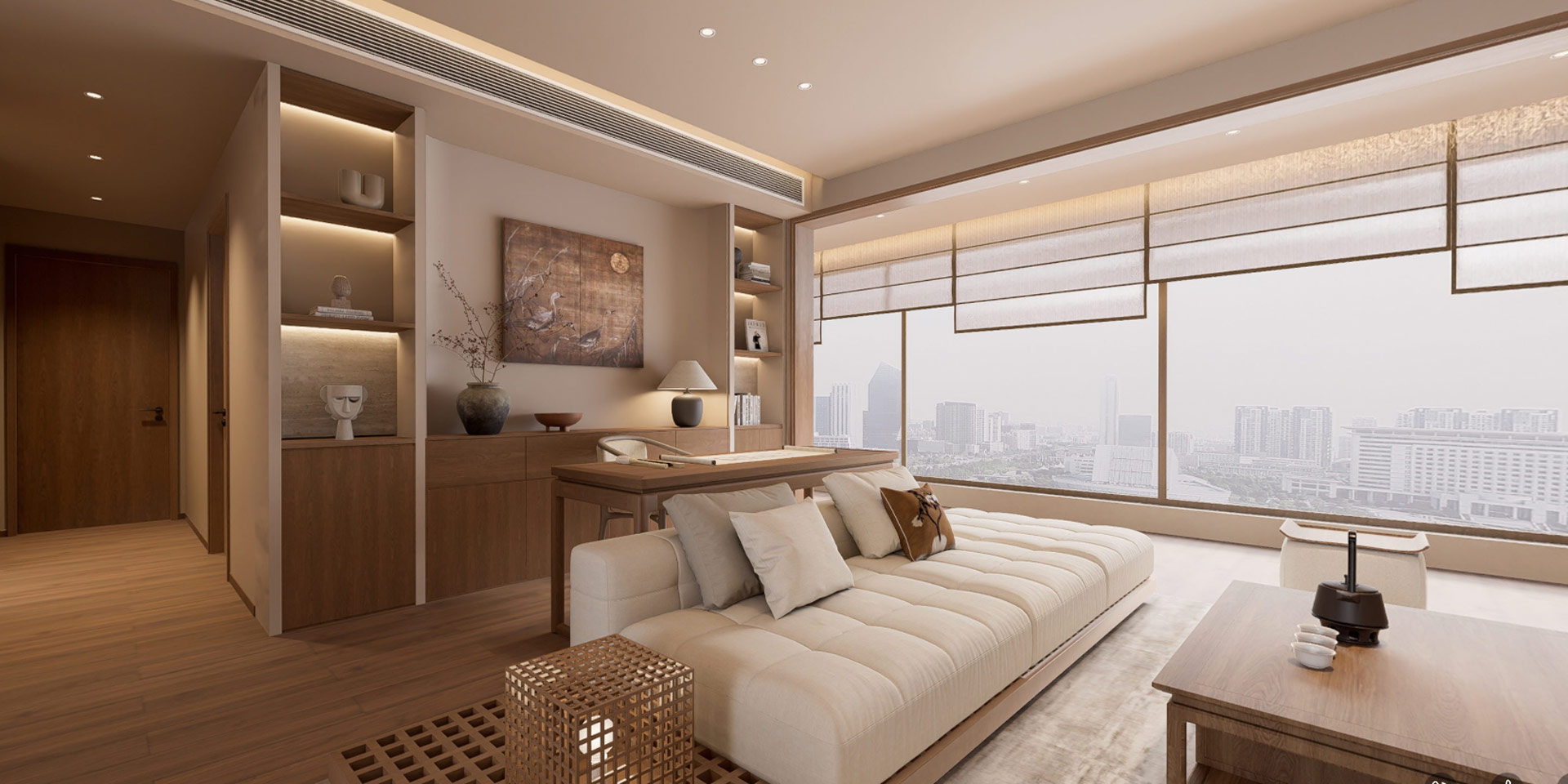 在简约的空间里通过材质、色彩的运用和软装的搭配呈现出现代轻奢的味道!石材与护墙板的混合使用,再加上金属线条的点缀使电视背景墙成为整个空间的一大亮点!